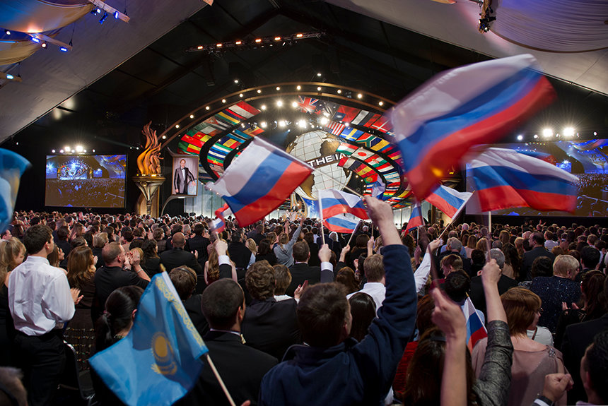 More than 6,500 Scientologists, representing some 50 nations, advancing into the Great Hall for a celebration.