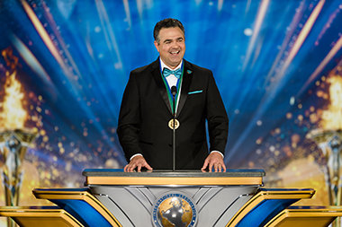 Mr. David Miscavige, ecclesiastical leader of the Scientology religion, takes the stage in the Grand Marquee before the energized crowd that awaits the beginning of an unforgettable evening.